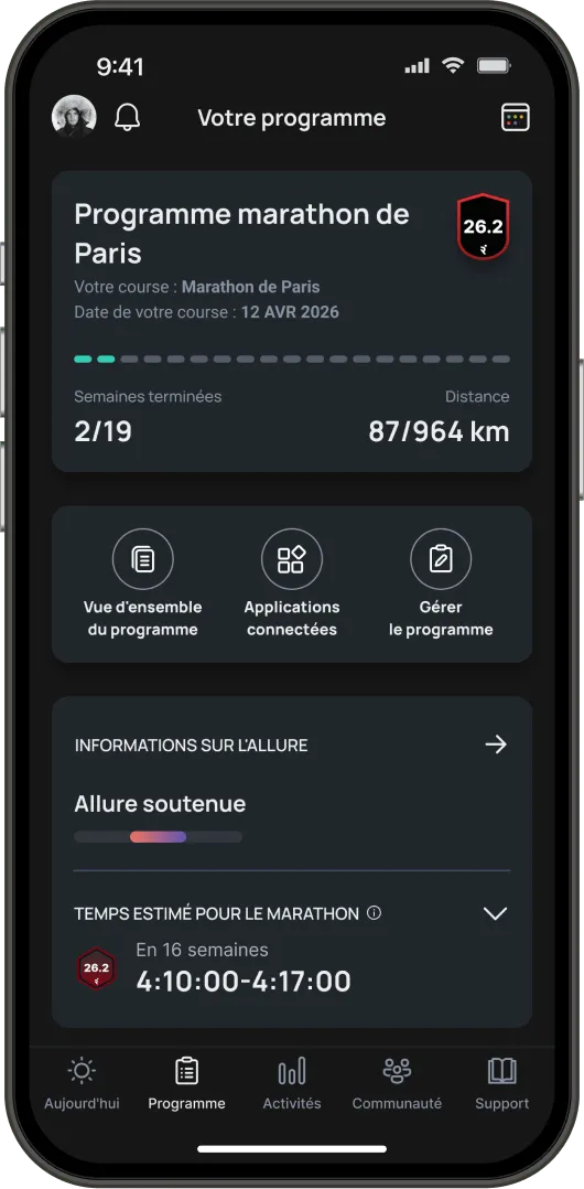 Après avoir créé un compte, téléchargez Runna sur iOS ou Android. Votre programme sera disponible à portée de main.